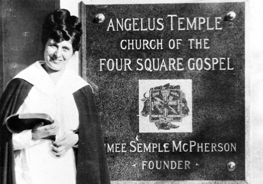 En 1923, Aimee fundó la primera iglesia Cuadrangular, Angelus Temple, en Los Ángeles. Ahí celebró cultos presentados en cinco idiomas, animó a la ‘oración-las-24-horas’, y creó “sermones ilustrados” para traer el evangelio a la vida por medio de las artes, cerca del incipiente escenario de Hollywood en la ciudad. Ella abrió un comisariato y alimentó a más de 1.5 millones de personas durante la Gran Depresión. Exploró nuevas tecnologías y se convirtió en la primera mujer en predicar un sermón por la radio, que llegó hasta las islas de Cabo Verde frente a la costa africana.